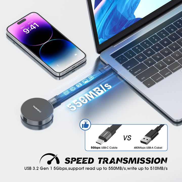 You can connect the Magnetic Portable SSD to your computer using a Type-A or Type-C data cable. You can purchase a compatible adapter or data cable that supports data transfer. To achieve the highest speeds, ensure that the main device, data cable, and adapter all support speeds of 20Gbps or above.